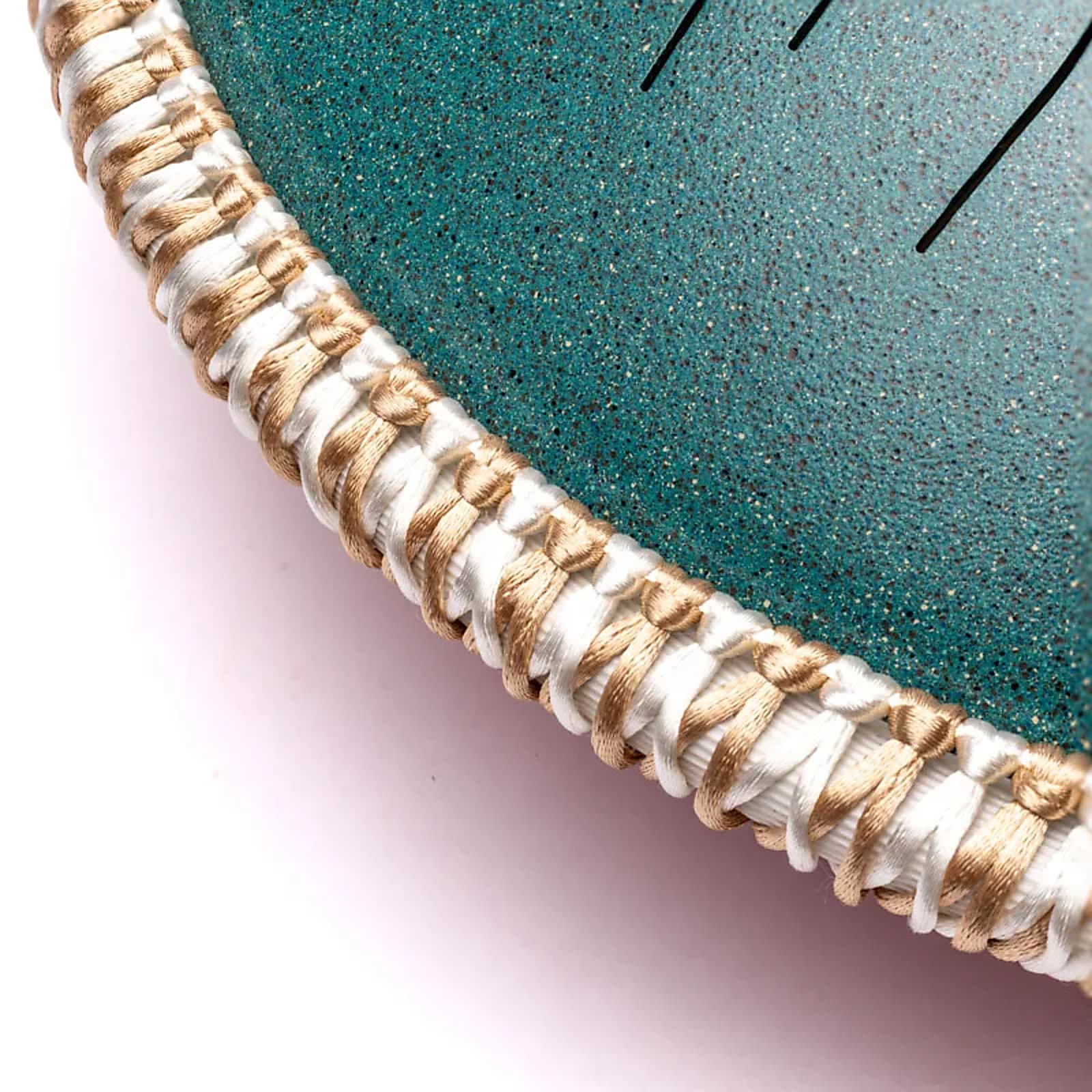 Die Hybrid-Konstruktion kombiniert eine Spielfläche aus lebendigem Titanstahl in Türkis mit einem resonierenden Körper aus massivem Birkenholz in Tiefrot, umrahmt von feinem Rattan-Geflecht. Egal, ob akustisch oder elektrisch, die Hluru sorgt für einen warmen, vollen Klang mit variablen Obertönen – perfekt für Auftritte und Aufnahmen dank des integrierten piezoelektrischen Tonabnehmers.