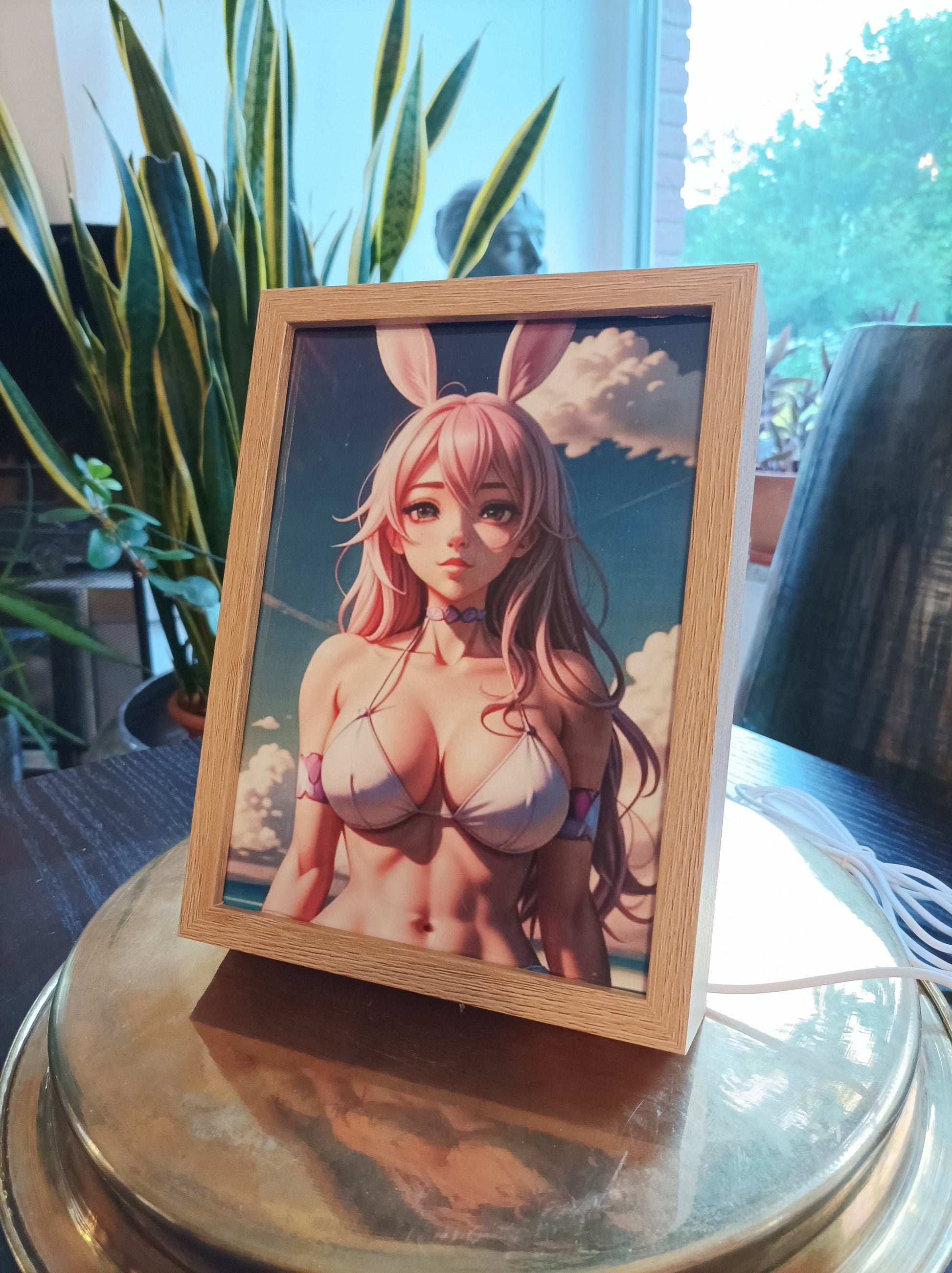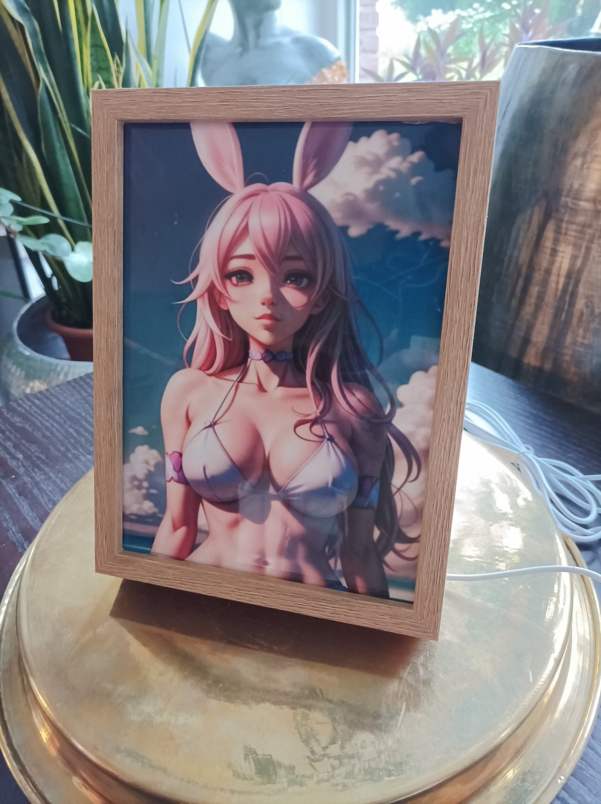 This elegant wooden frame features an enchanting anime motif and is equipped with LED backlighting to brighten up any room. Perfect for anime lovers, this frame offers a unique way to display your favorite artwork.