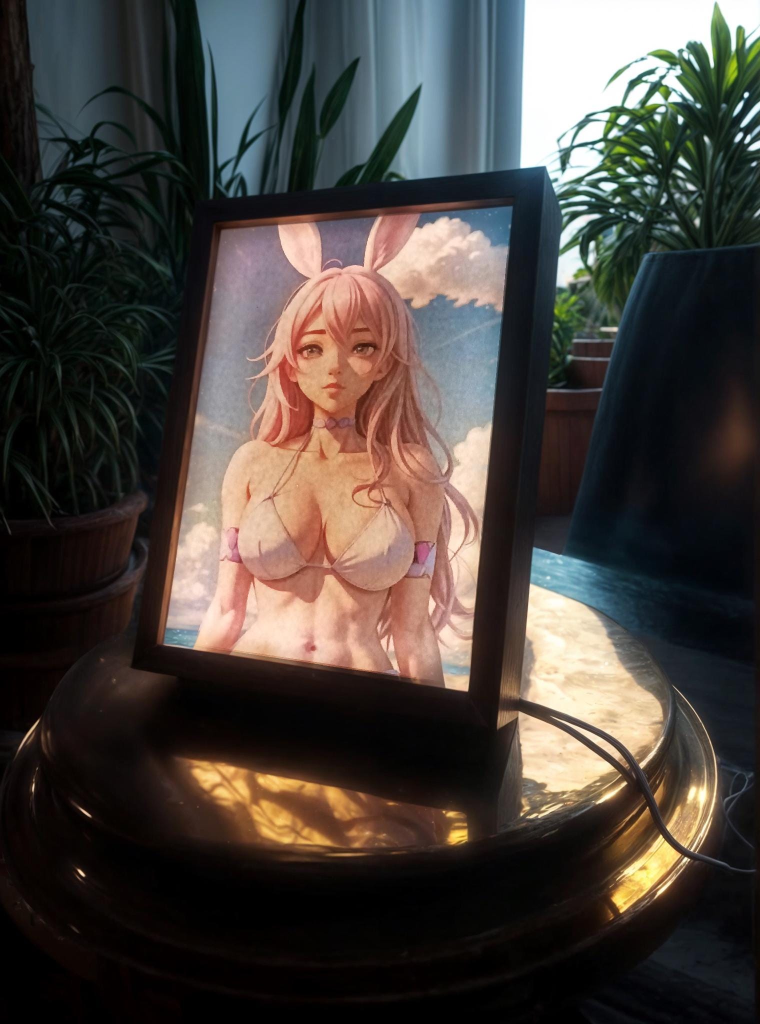 High-quality wooden frame anime motif with LED backlight. Includes remote control for light control and power supply via USB port.