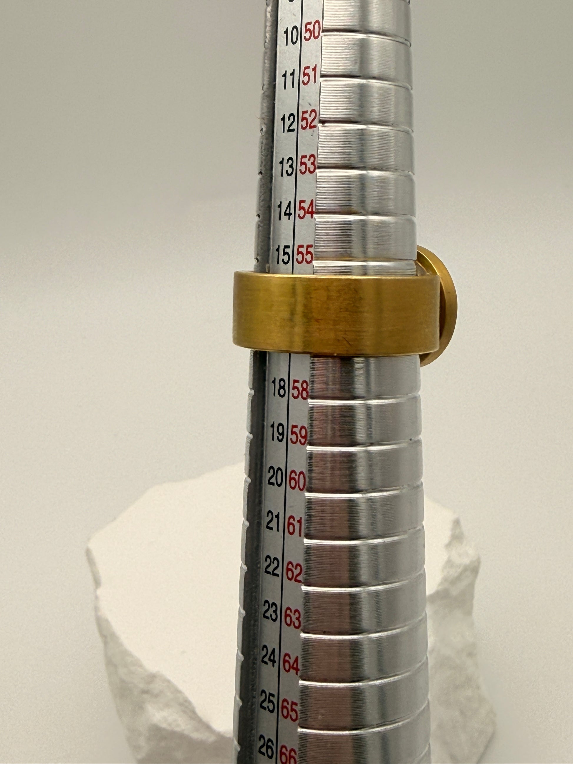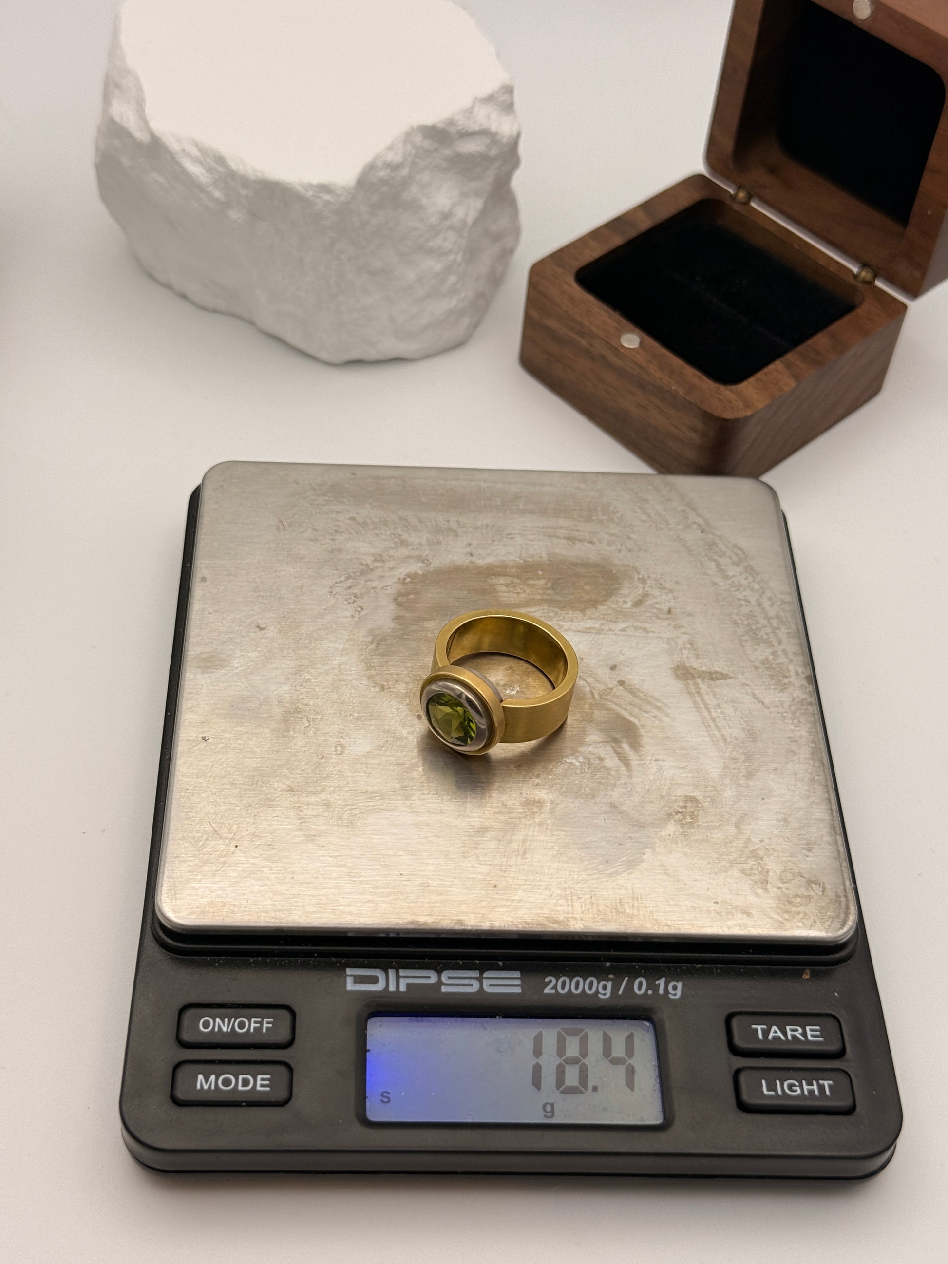 Dieser außergewöhnliche Designerring aus massivem 750er Gold besticht durch seine puristische Eleganz und eine beeindruckende Schwere von 18,4 Gramm. Im Zentrum thront ein intensiv olivgrüner Peridot im runden Facettenschliff, dessen lebendiges Funkeln in wunderbarem Kontrast zur warmen Ausstrahlung des Edelmetalls steht – ein kraftvolles Statement für Liebhaber moderner Goldschmiedekunst.