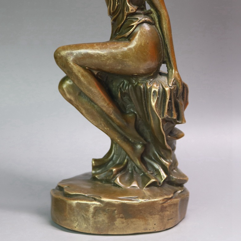 Ta elegancka figurka przedstawia wdzięczną, siedzącą postać kobiecą, bogato zdobioną. Jej płynne kształty i delikatne draperie nadają jej nutę klasycyzmu i romantyzmu. Dzięki ciepłemu, brązowemu połyskowi rzeźba przyciąga wzrok i dodaje stylowego akcentu każdemu wnętrzu. Niezależnie od tego, czy umieścisz ją na kredensie, w gablocie, czy jako wyjątkową ozdobę stołu, ta mosiężna figurka to ponadczasowe dzieło sztuki, które harmonijnie wpisuje się w wiele koncepcji aranżacji wnętrz.