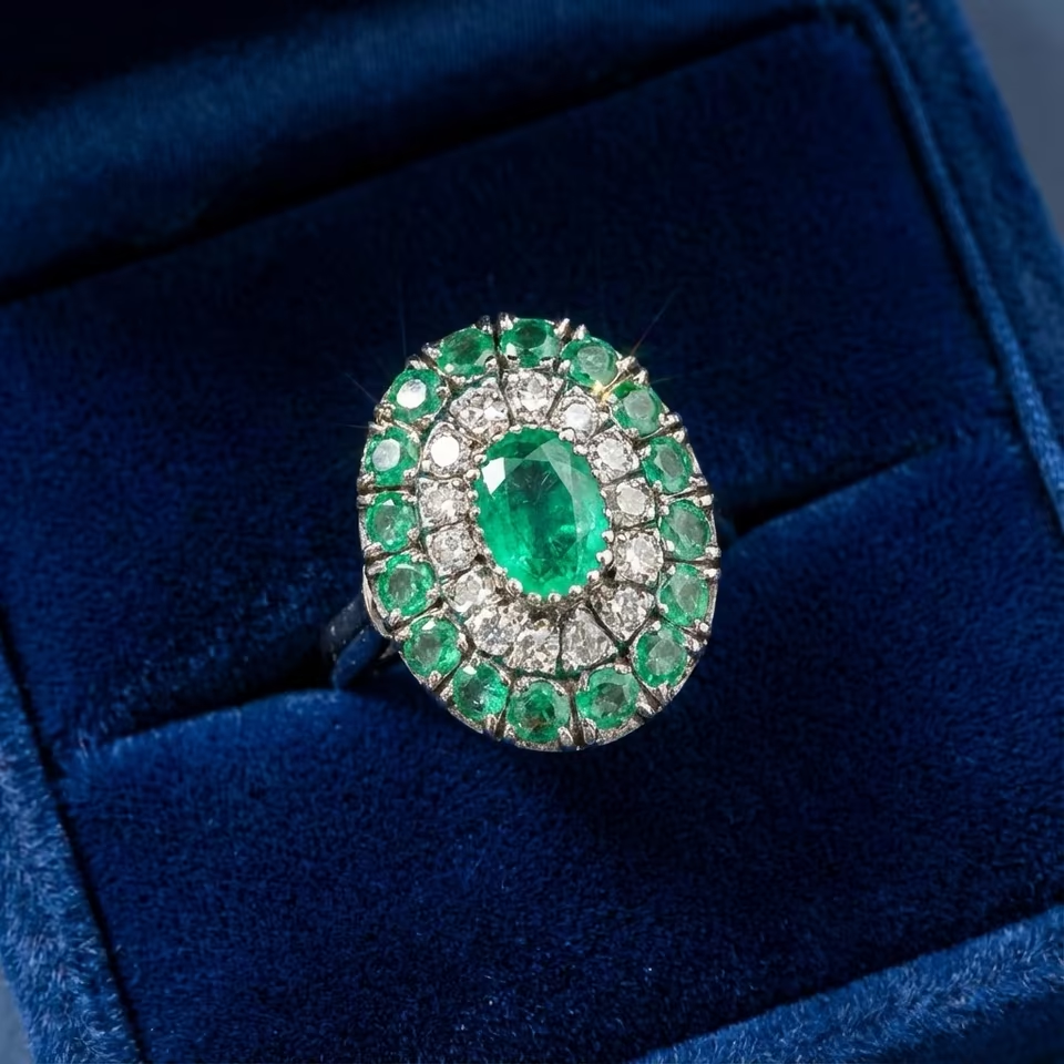 Das Herzstück bildet ein leuchtender, oval facettierter Smaragd in lebhaftem, leicht bläulichem Grün, der sofort alle Blicke auf sich zieht. Umrahmt wird dieser von einem inneren Kranz aus funkelnden Diamanten und einem äußeren Kranz weiterer Smaragde – ein klassisches Design, das typisch für die hohe Juwelierkunst des Viktorianischen Zeitalters um 1880 ist. Die im historischen Altschliffverfahren bearbeiteten Steine verleihen dem Ring ein einzigartiges, weiches Feuer.