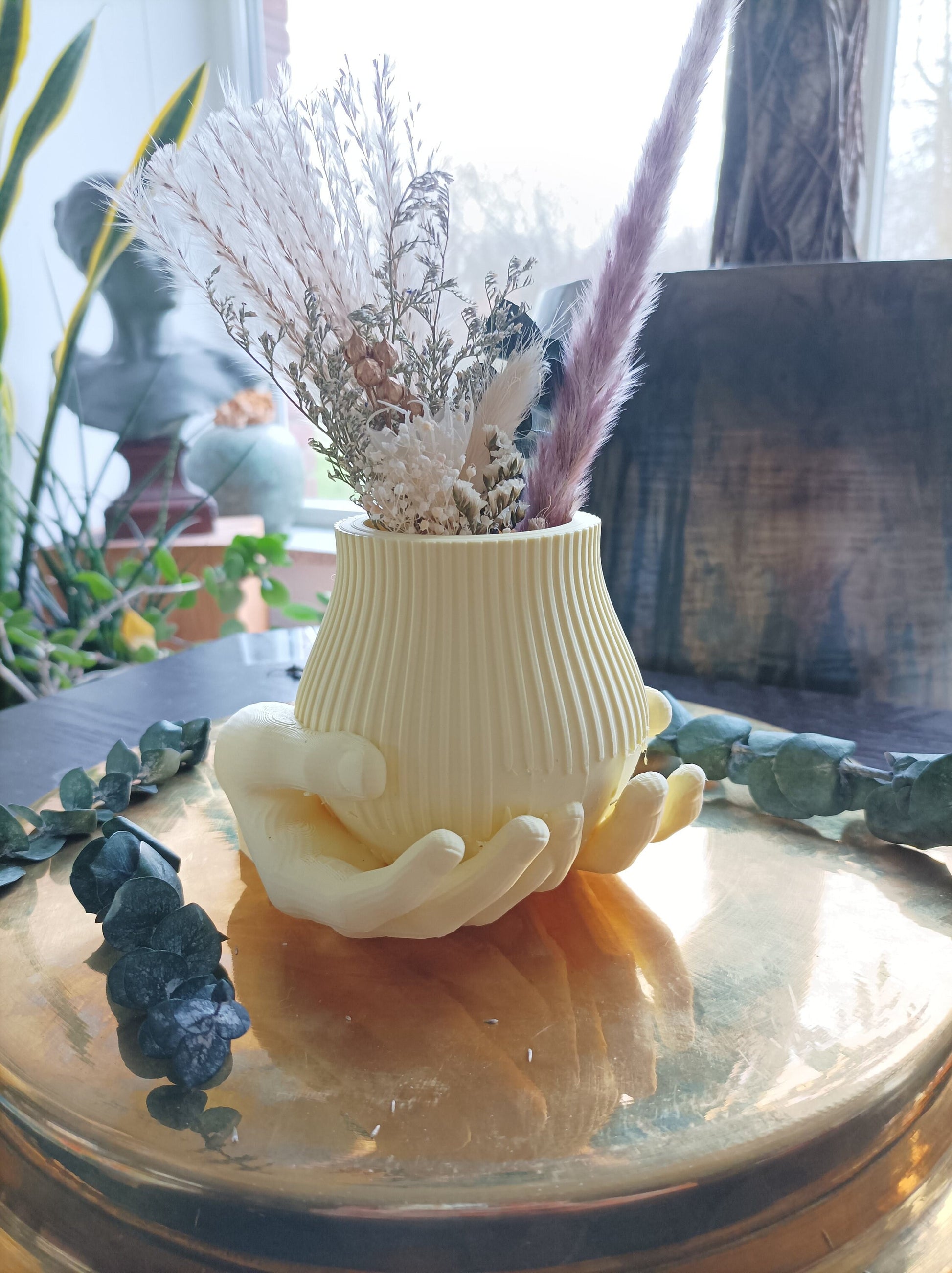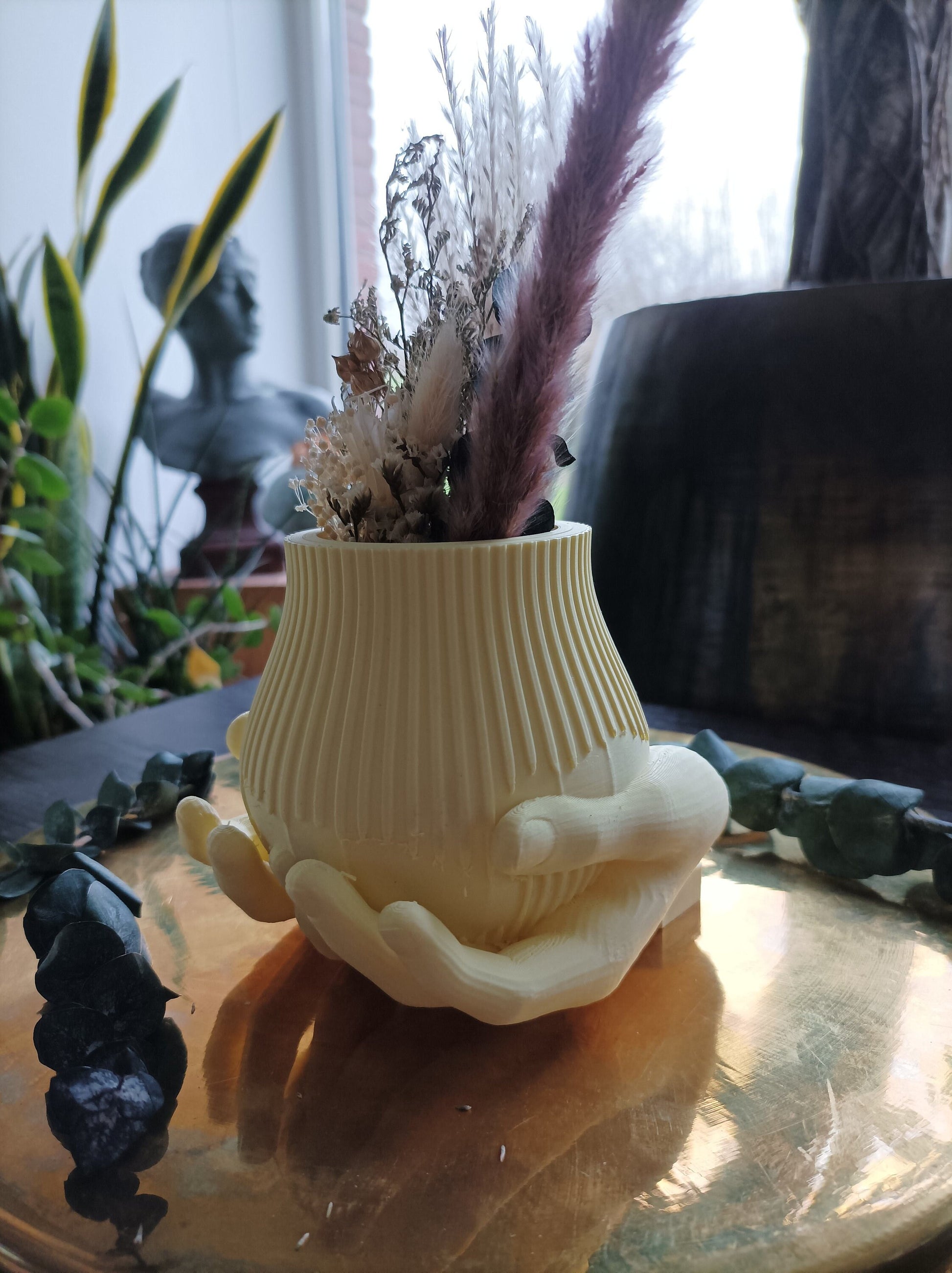 Odkryj unikalne połączenie sztuki i funkcjonalności z naszym ręcznie formowanym wazonem wykonanym z drukowanego w technologii 3D tworzywa PLA. Ten produkt został zaprojektowany specjalnie do eksponowania suszonych kwiatów i doda kreatywnego akcentu każdemu wnętrzu. Każdy wazon to dzieło sztuki, wykonane z ekologicznego tworzywa PLA. Jego teksturowana powierzchnia i naturalny, kremowy kolor harmonijnie komponują się z każdym wystrojem, od klasycznego po nowoczesny. Innowacyjny projekt przedstawia dłoń trzymającą i prezentującą Twoje kwiatowe skarby. Idealny dla osób o pozytywnym nastawieniu, poszukujących wyjątkowego, zrównoważonego produktu, który jest jednocześnie stylowy i wzbudza zainteresowanie.
