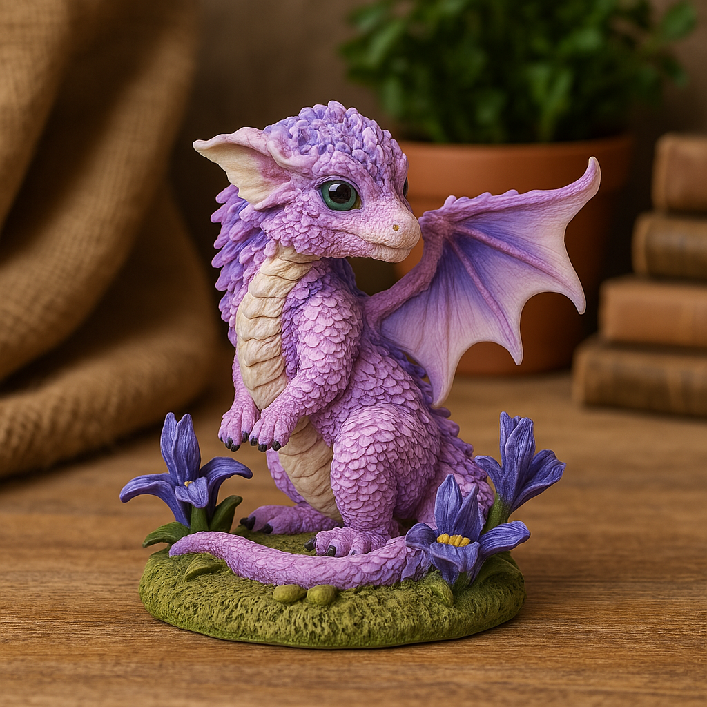 Mały smok siedzi na misternym cokole z fioletowymi kwiatami irysów – idealnym elementem dekoracyjnym półki, ołtarza lub gabloty. Wykonana z wysokiej jakości żywicy poliestrowej figurka zachwyca finezyjną strukturą i solidnym wykonaniem.