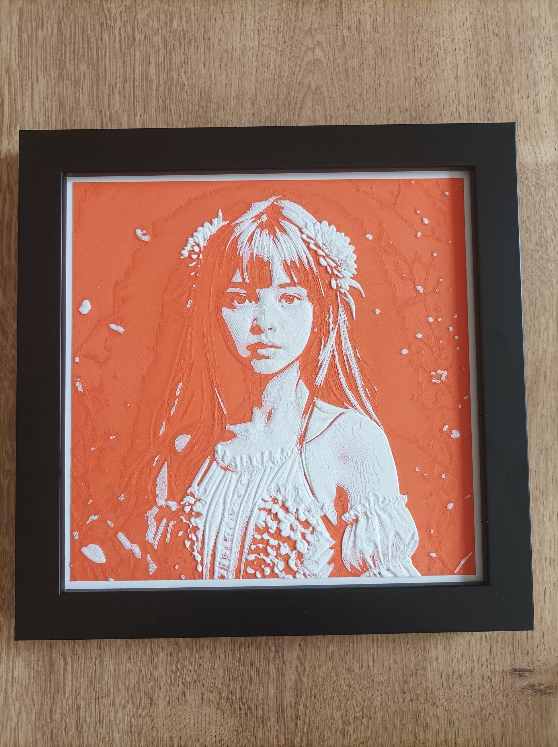 Doświadcz wyjątkowego połączenia sztuki i technologii dzięki temu wydrukowanemu w 3D portretowi młodej dziewczyny, mistrzowsko wykonanemu z materiału PLA. Oprawione w stylową ramę, to nowoczesne dzieło sztuki w odcieniach pomarańczu i bieli doda dynamiki i świeżości każdemu wnętrzu. Dzięki kompaktowym rozmiarom 22 x 22 cm idealnie sprawdzi się na małych i dużych ścianach. Rozmiar: 22 x 22 cm – idealny do różnorodnych aranżacji. Paleta kolorów: Żywa pomarańcza i czysta biel – prawdziwy magnes. Materiał: Wysokiej jakości PLA – trwały i przyjazny dla środowiska. Oprawa: Klasyczna czerń, podkreśla intensywność barw dzieła. Przedstawienie: Młodzieńcze piękno uchwycone w ponadczasowej chwili. Styl: Nowoczesna sztuka ścienna, idealnie komponuje się z minimalistycznym lub nowoczesnym wystrojem.