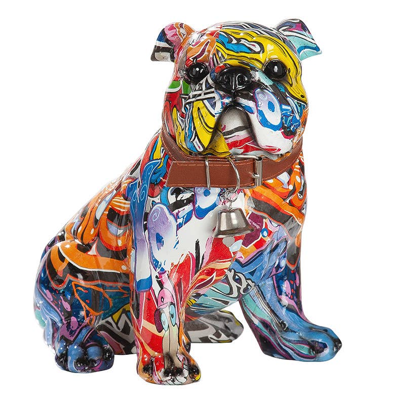 Figurka oly-Pug w modnym stylu street art. Szczegółowo wykonane, siedzące psy wykonane są z wytrzymałej żywicy poliestrowej i dodają kolorowych akcentów do domów i firm. Idealnie sprawdzą się jako element przyciągający wzrok na półce, kredensie lub wystawie sklepowej. Odporna na zarysowania, łatwa w pielęgnacji i trwała – idealna dla miłośników nowoczesnego popu i sztuki miejskiej. Dostarczana w zestawie dwóch sztuk.