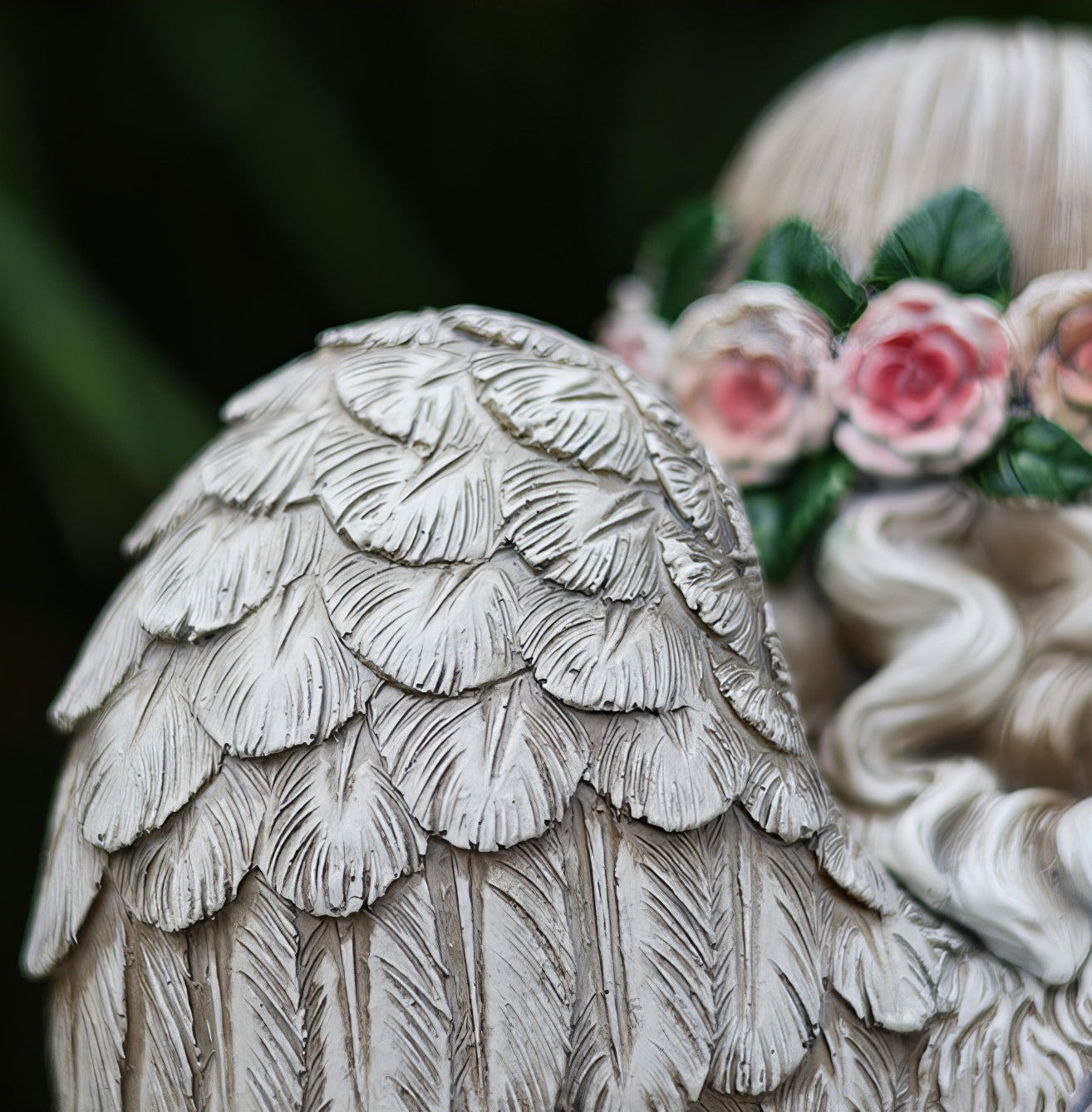 Dodaj odrobinę magii do swojego ogrodu lub grobu dzięki tej pięknej figurce anioła zasilanej energią słoneczną! Ubrany w delikatne kolory i ozdobiony wiankiem z kwiatów, ten modlący się anioł symbolizuje spokój i harmonię. Dzięki wbudowanym lampkom solarnym, jego skrzydła i pierś delikatnie świecą o zmierzchu, tworząc czarującą atmosferę.