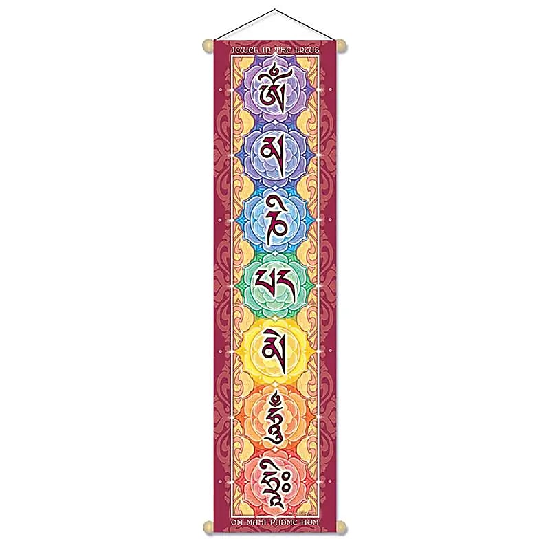 Ten baner jest kreatywną interpretacją dzieła artysty, który przedstawił sylaby nasienne mantry Om mani padme hum hri w siedmiu...