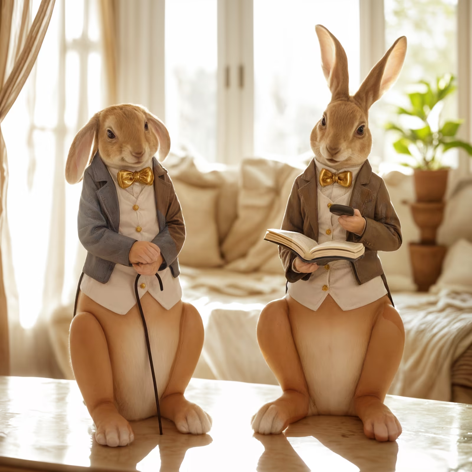 Diese charmanten Hasen-Figuren bringen Stil und Frühlingslaune in dein Zuhause! Die beiden detailverliebten Deko-Hasen sind edel gekleidet: einer liest gemütlich ein Buch mit einer Tasse in der Hand, der andere lehnt sich mit Spazierstock entspannt zurück. Die goldene Fliege, die eleganten Jacken in Blau und Braun sowie die liebevolle Gestaltung machen sie zu einem echten Hingucker – perfekt für die Osterzeit oder als außergewöhnliche Ganzjahresdeko.