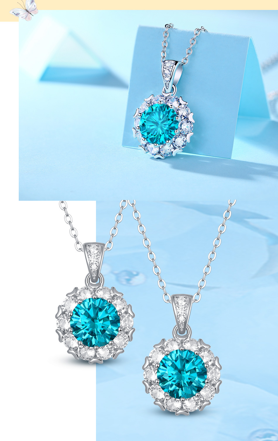 - Material: Hauptstein aus Mosan-Diamant, Umrandung aus Zirkonia-Steinen, Kette aus 925er Sterlingsilber