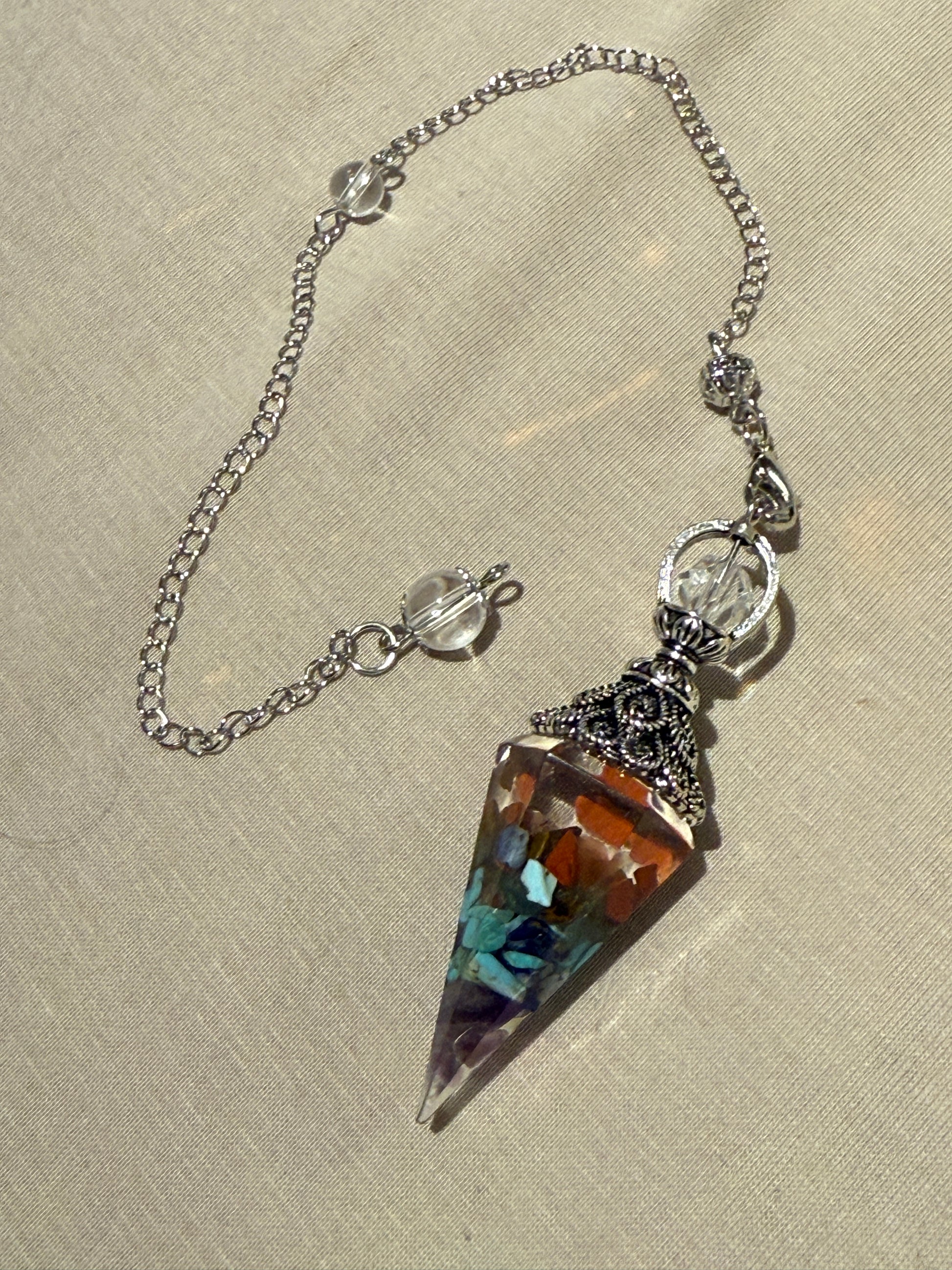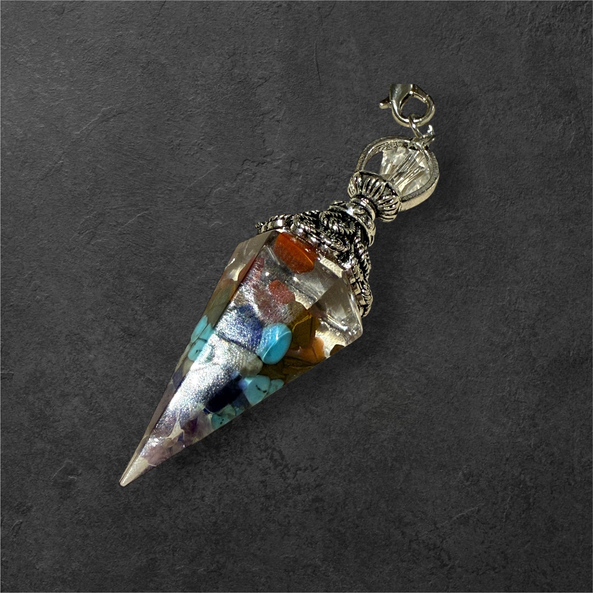 Gefertigt aus einem Kristallkegel, der mit bunten Edelstein-Chips gefüllt ist, symbolisiert es die 7 Chakren und unterstützt dich bei Meditation, Reiki, Divination oder einfach als stilvolles Schmuckstück.