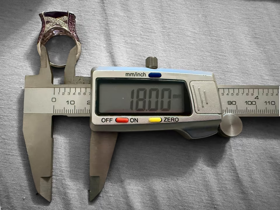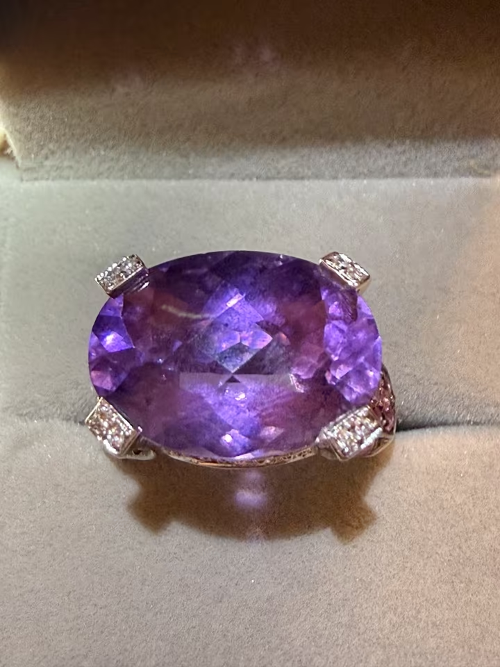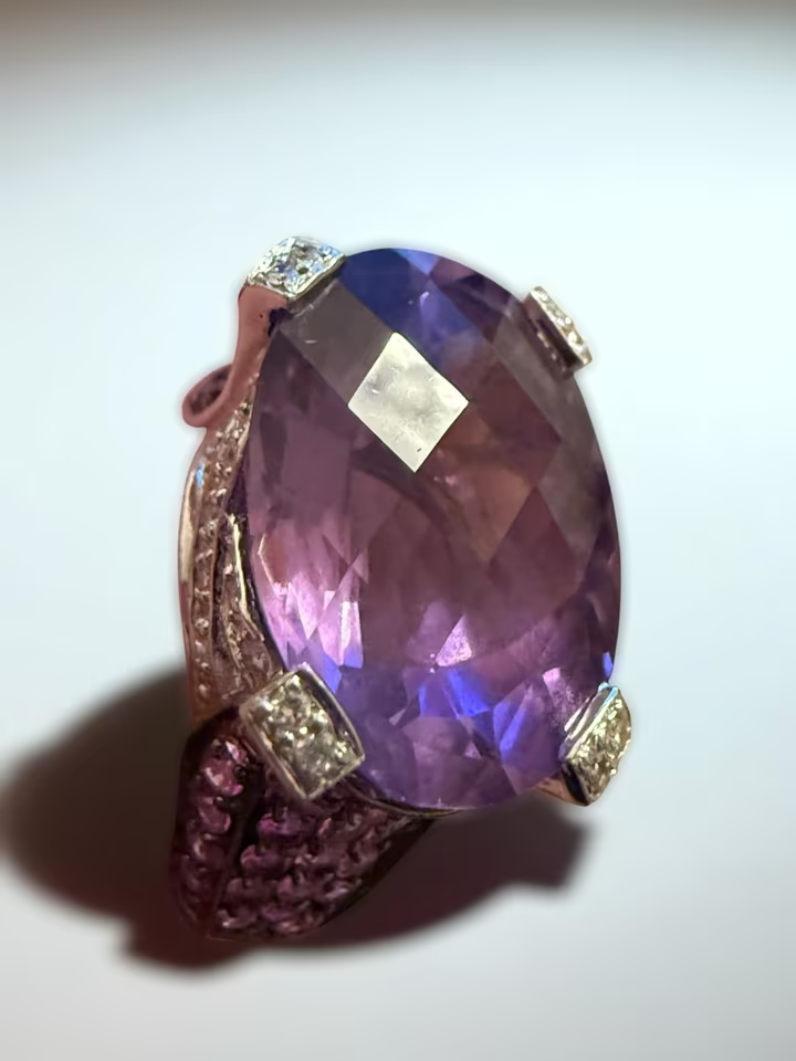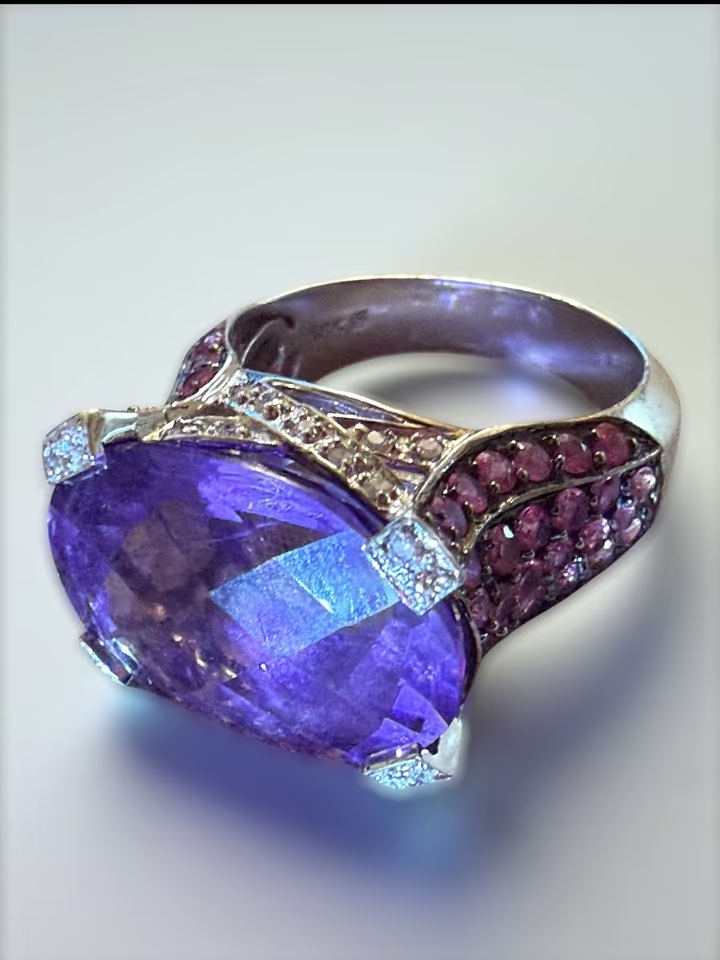 Ergänzt wird er durch zahlreiche kleine lilafarbene Amethyste, die kunstvoll in die Ringschultern eingearbeitet sind. Leuchtende Rubine sorgen für einen edlen Kontrast, während echte Diamanten in der Kreuzfassung das Gesamtbild mit funkelnden Highlights abrunden.