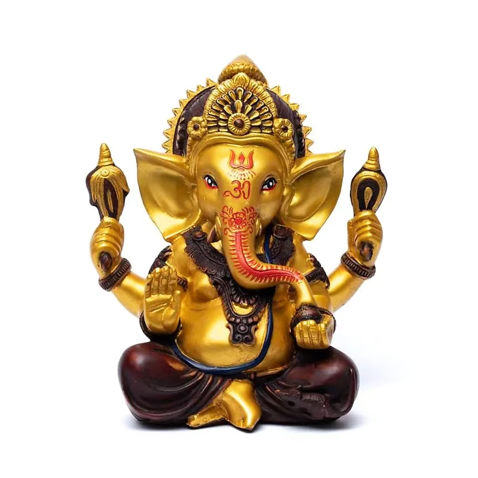 Die Statue ist detailreich gestaltet, mit goldfarbenem Finish und liebevoll bemalten Akzenten. Besonders die filigrane Krone und die spirituellen Symbole auf Stirn und Rüssel verleihen der Figur eine starke Präsenz. Ideal für Meditationsecken, Altare, Yogaräume oder als besonderes Geschenk.