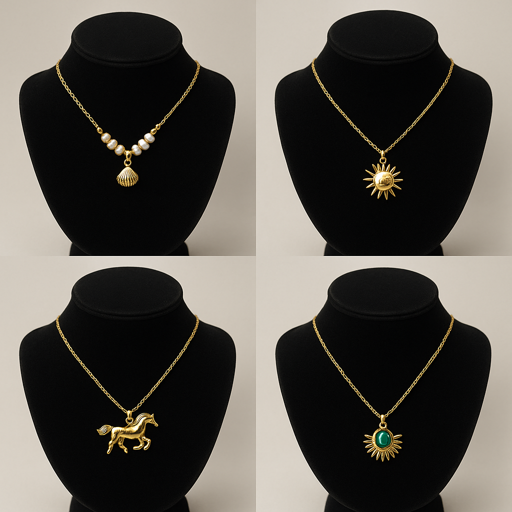 Goldfarbene Halsketten Damen Set – Muschel Sonne Pferd grüner Stein