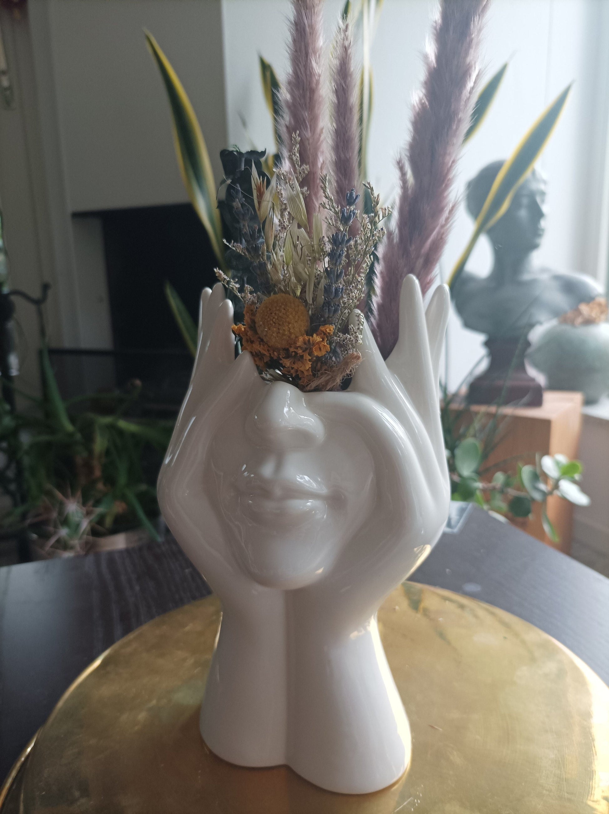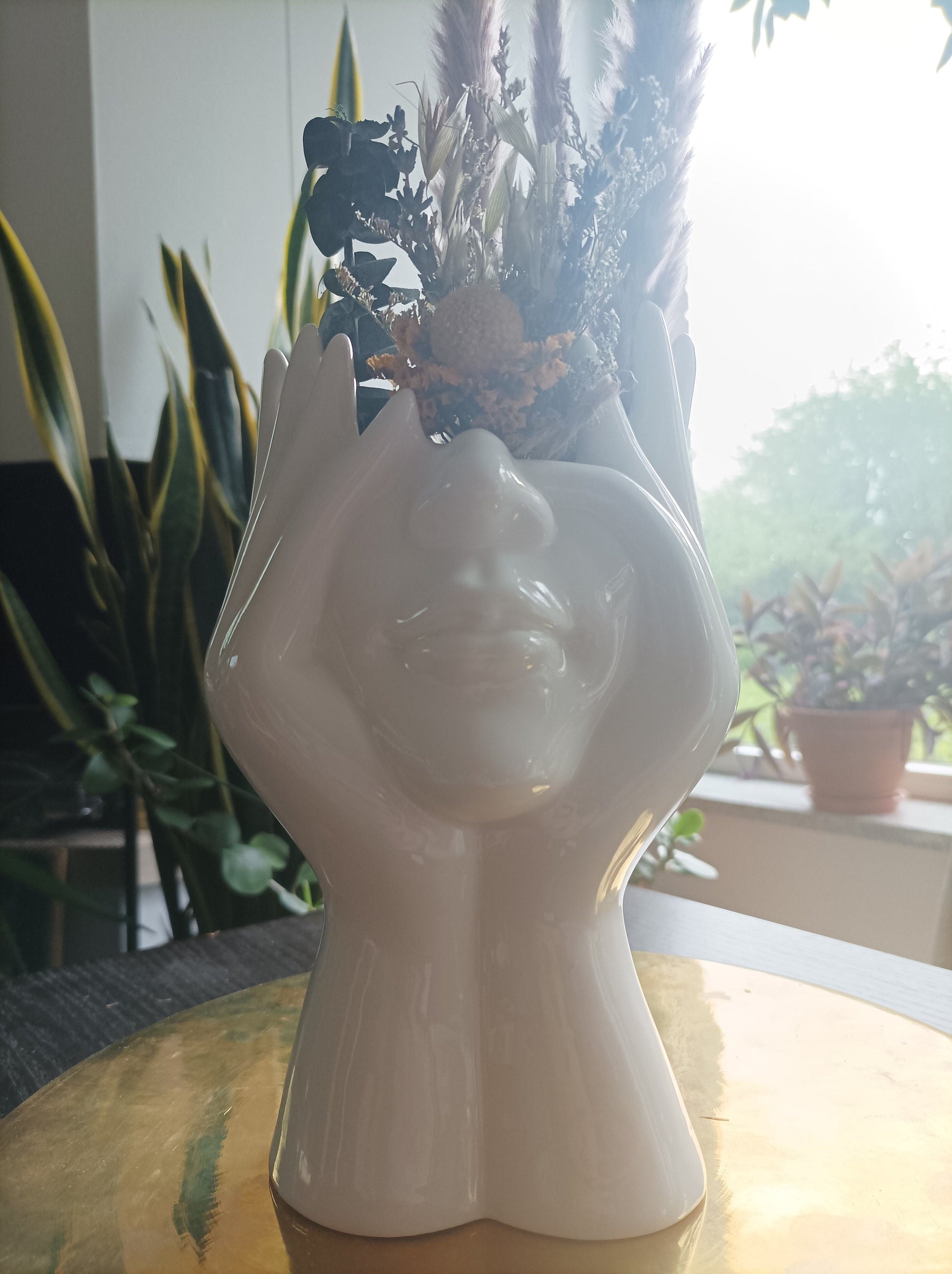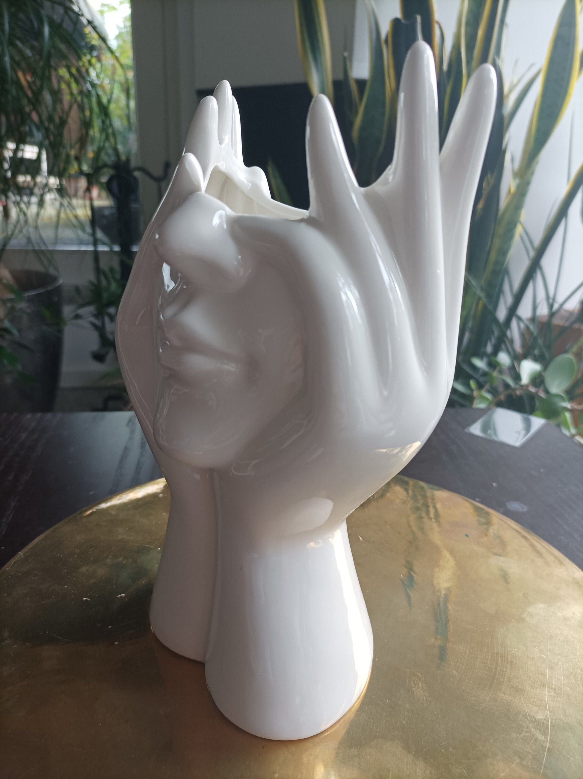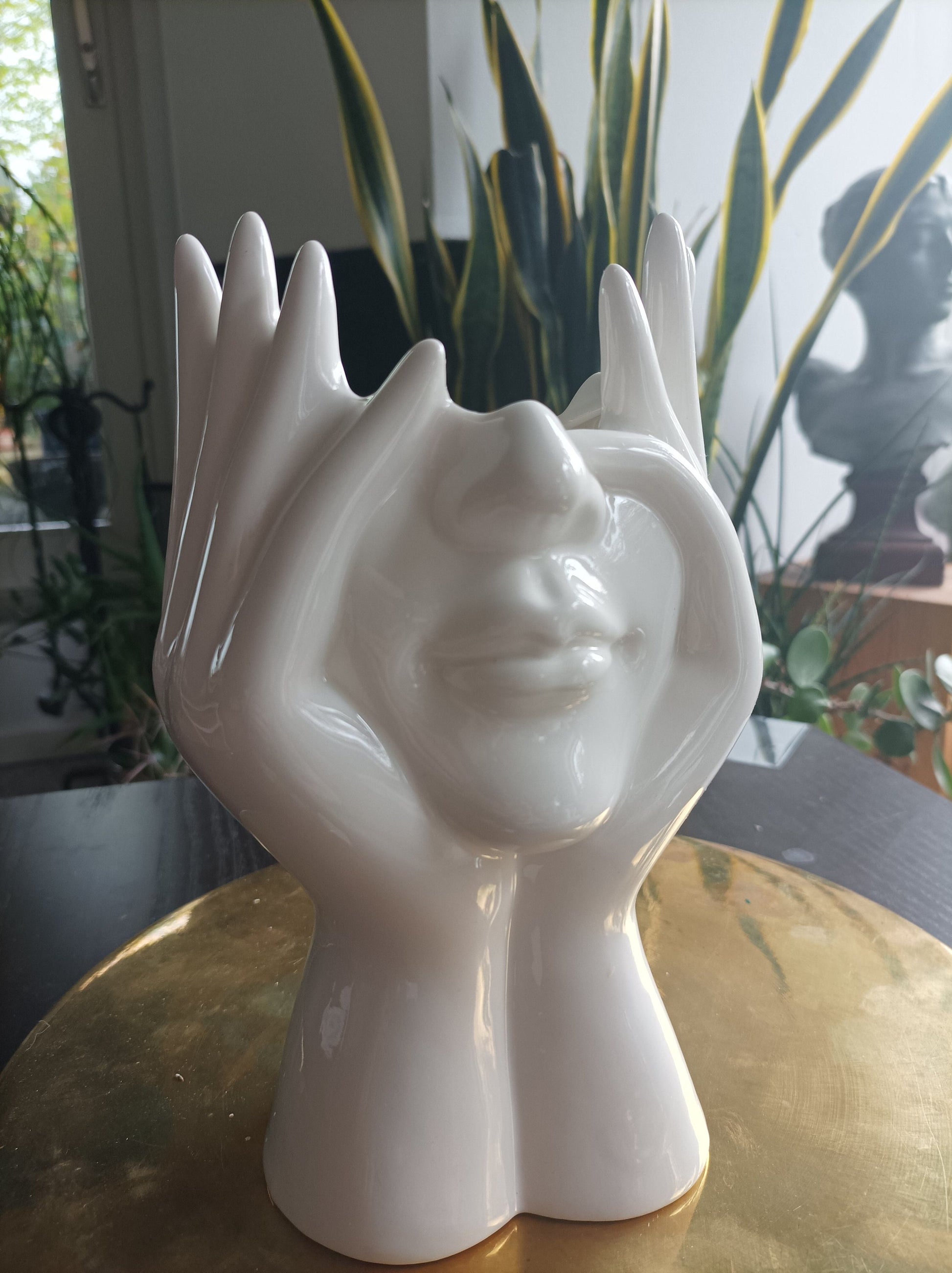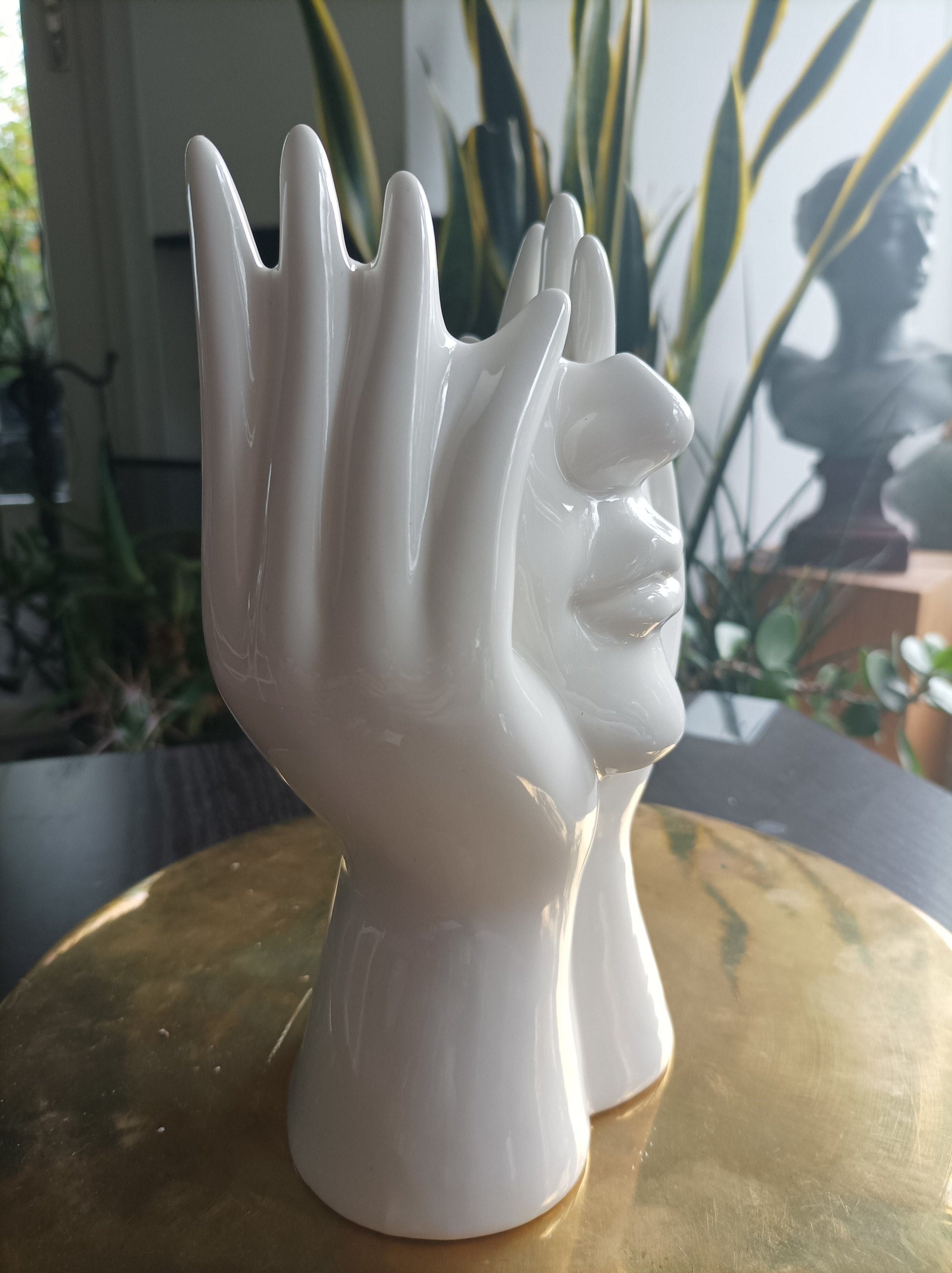 Diese außergewöhnliche Keramikvase, geformt wie eine Hand, die einen Kopf unterstreicht, bringt einen Hauch von Modernität und Eleganz in jeden Raum. Ideal für kleinere Blumenarrangements oder als digitales Kunstobjekt.
