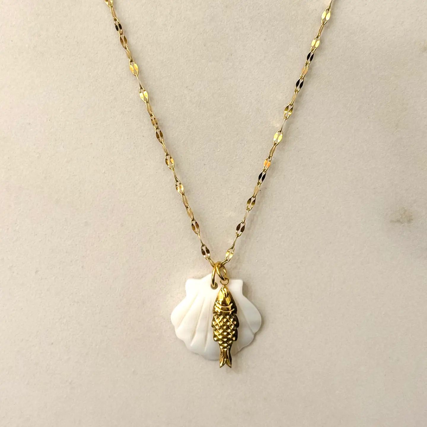 Beschreibung: Maritime Halskette mit weißer Muschel und goldfarbene Fisch. Perfekt für Urlaubs-Outfits. Neu & ungetragen.