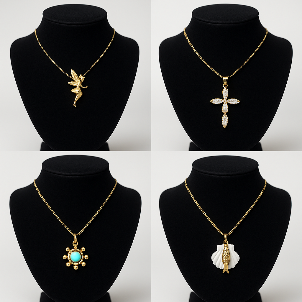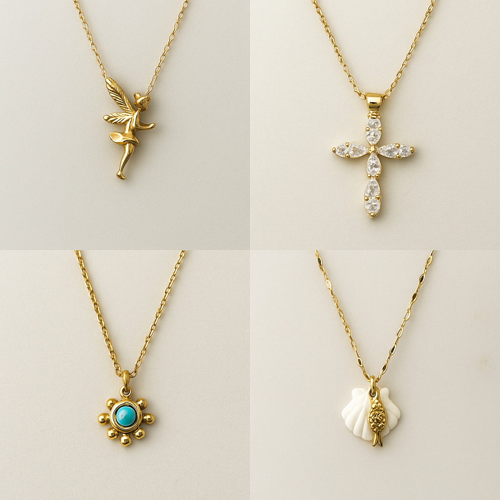 Vier Halsketten goldfarbene Fee Kreuz Türkis Muschel Fisch
