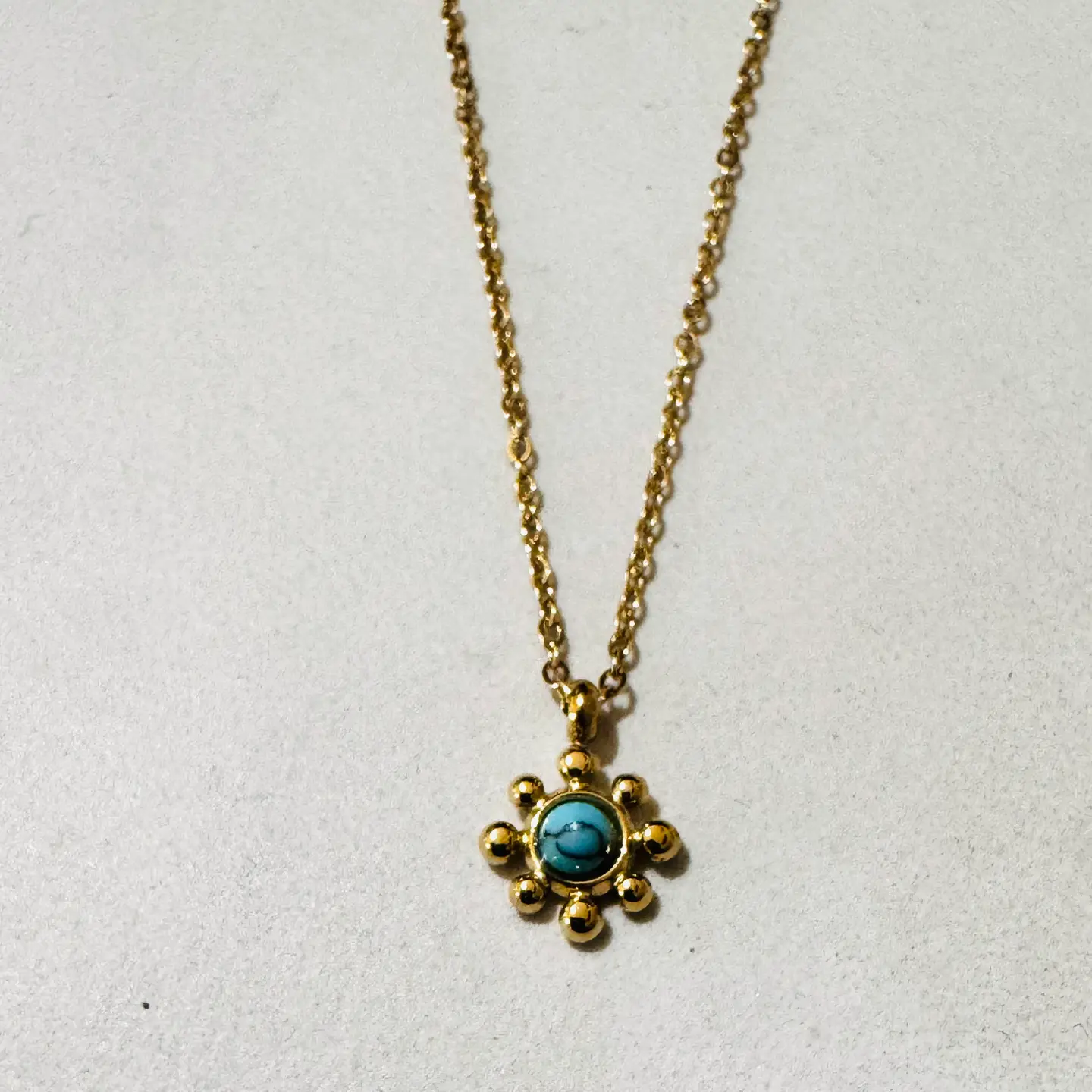 Titel: Türkis Sonnen-Anhänger Halskette goldfarbene– Boho | 25 € | kostenloser Versand